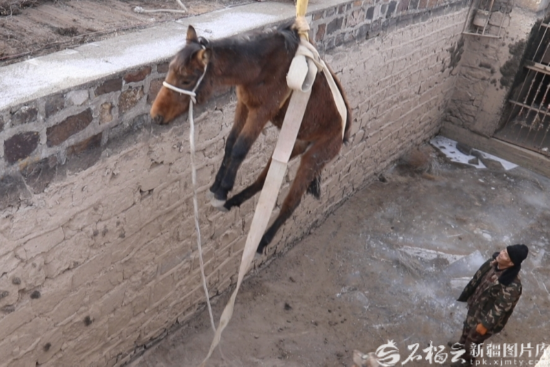 几名工作人员在确保安全的前提下,合力将绳索套在马匹身上。铲车缓慢提升,地面人员则在一旁牵引辅助、调整角度。经过近一个小时的紧张作业,这匹马终于被平稳地拉了出来。