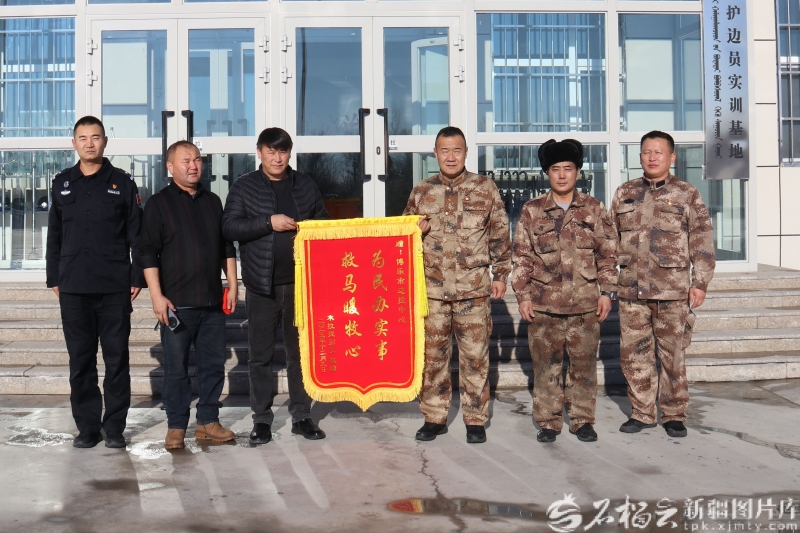 12月11日,博乐市青得里镇二牧场抵边村牧民木拉提别克·木汉将一面锦旗送到博乐市政法委边防委员会办公室民警手中,表示衷心感谢。朱晓彤摄