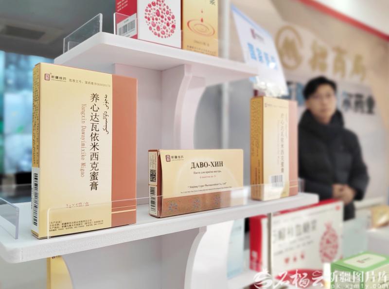 12月15日,工作人员在产品展厅介绍养心达瓦依米西克蜜膏。