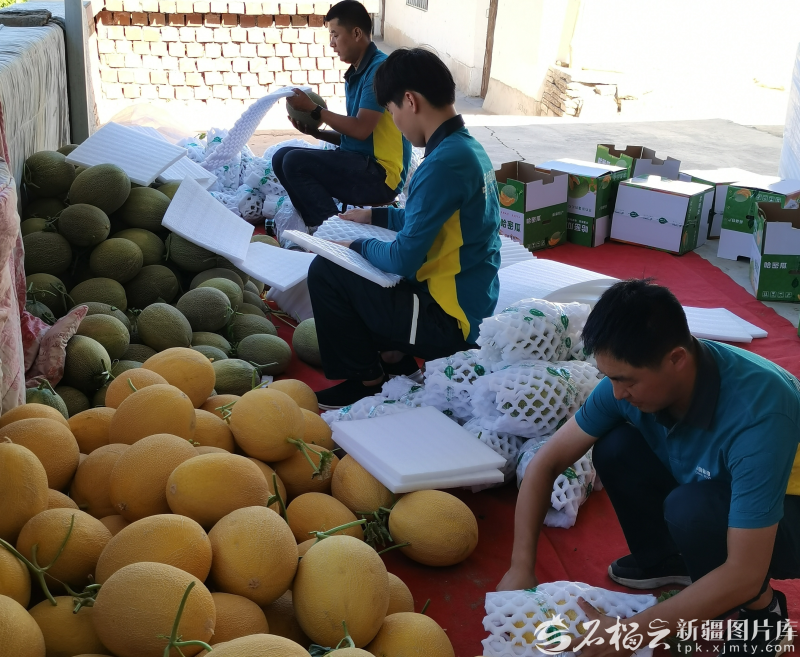 7月20日,哈密市邮政快递小哥在田边设置的收寄点打包发寄哈密瓜。苏洁摄