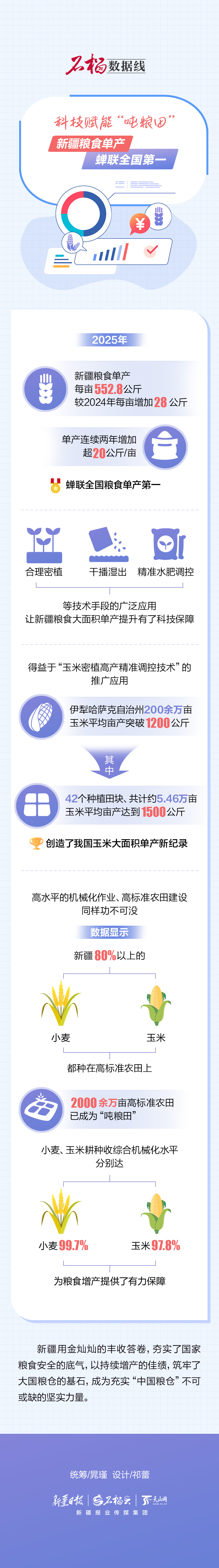 2025年新疆粮食单产每亩552.8公斤,较2024年每亩增加28公斤,单产连续两年增加超20公斤/亩,蝉联全国粮食单产第一。