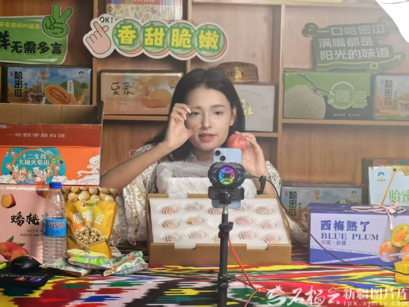 吐鲁番市高昌区亚尔镇新城西门村,返乡大学生古丽孜把·艾孜买提在直播销售村里的水果。(资料图)石榴云/新疆日报记者 魏永贵摄