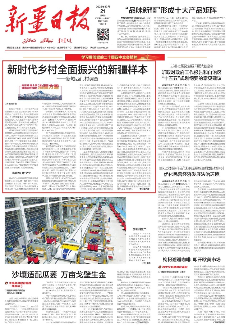 合作动力。新城西门村的发展,离不开援疆力量的强力支持。到2025年,湖南省已累计派出十批1363名干部人才来到吐鲁番,接力培育的援疆品牌“红石榴”覆盖产业、医疗、教育、文化各领域。为建设美丽乡村,湖南援疆投资1600多万元建设红石榴产业园区;为提高村民收入,湖南援疆因地制宜帮助发展乡村产业,协助打造新城西门村首个年产3000吨的葡萄干精深加工企业;从“毛医生”的定期医疗惠民,到湖南十八洞村与新城西门村的两地情深,这些跨越山海的互促共进,化为干事创业、携手奋斗的不竭动力。