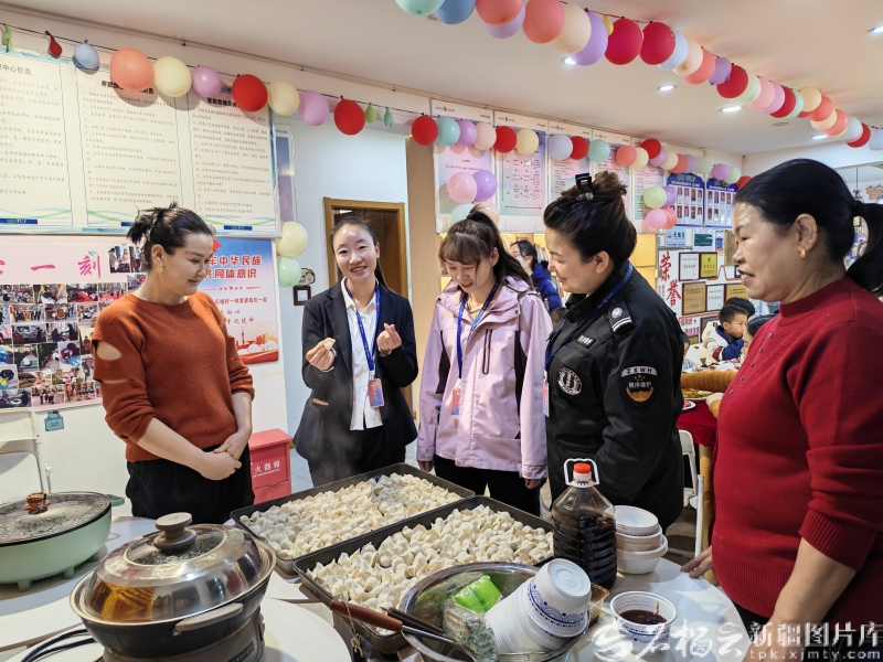 12月21日,阿克苏市红桥街道双拥社区举行“多浪河畔一家亲”迎冬至活动。黎媛媛摄 冬至大如年,人间小团圆。当天,在双拥社区新时代文明实践站铺着红色布料的桌子上,摆满了香蕉、橘子、饼干等食品。原本并不相识的社区干部古丽胡玛·艾合旦木与新疆澜湾之家物业管理有限公司工作人员黎媛媛,也在温馨的互动中熟络起来。闻讯前来的各族居民纷纷加入,实践站里充满问候与笑声。老党员、志愿者、小学生……大家围坐在桌前,聊健康、说学习、议小区建设,氛围融洽。 和面、擀皮、拌馅……在包饺子环节,汉族、维吾尔族、哈萨克族、柯尔克孜族等居民齐动手,一边协作一边分享冬至的由来、习俗与饺子的文化寓意。“冬至不端饺子碗,冻掉耳朵没人管,饺子可是冬至的标配。”陈静和其曼古丽·买买提两人,一个细心指导,一个认真听、动手试。很快,你擀皮、我包馅,两人分工协作、一气呵成,说笑间,一排排圆润饱满的饺子,便整整齐齐摆了一盘子。