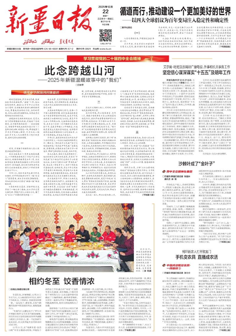 江仲平 时间是有情物,岁月为无尽藏。梳理2025年的新疆故事,“温暖”二字,犹如灿烂的阳光,洒满166万多平方公里的山川原野。这温暖由无数动人瞬间凝结而成,带着我们共同的记忆、共同的情感,从天山南北到祖国各地,从你我身边到网络云端扑面而来。 温暖在时光的肌理间流淌。它是天安门前凝望国旗的热泪,是驰援千里的馕香,是万键同奏的旋律……这汩汩暖流,为铸牢中华民族共同体意识写下了最鲜活的注脚。回望这一年,那些散落于岁月长河的暖心瞬间,已交织成一幅2600多万天山儿女团结同心的壮阔长卷,在时光深处徐徐铺展。 一 爱国,是深植于新疆各族人民心底最温暖真挚的情怀。 在自治区成立70周年主题成就展上,一个视频画面吸引了习近平总书记的目光。视频里的故事是今年7月,来自和田地区策勒县策勒镇的10岁女孩帕提曼罕·排日海提,在天安门前观看升国旗仪式时激动落泪,短短几十秒的画面打动万千人心。 今年3月,在和田县阿瓦提乡阿克恰勒村,村干部胡春芳打印了一幅“天安门”背景幕布,两百多位村民争相留影,用如此朴素的方式感受“祖国心脏”的温暖跳动。 9月的帕米尔高原,彩绘师哈力克手绘了一幅天安门墙画,让90岁护边员尤勒巴斯·布塔汗在九三阅兵当天,圆了与“天安门”同屏的毕生梦想…… 这些场景,是寻常情愫在特定时刻的集中迸发,它们清晰印证着,新疆各族人民对伟大祖国的炽热情感无处不在、坚定如磐。 五星红旗升起的天安门,是每一个中国人的精神家园。我们生来就能感受这个国家符号背后的温度,这是中华民族深植于血脉的历史与记忆,更是中华儿女心中跨越山海、无法超越的情感共鸣。在天安门前看一次升国旗仪式或是打个卡,是很多中国人心中的执念,而这就是爱国主义最朴素的表达。这种情怀始终流淌在新疆各族儿女的血脉中,从来不需要想起,永远也不会忘记。 今年6月,在昌吉回族自治州吉木萨尔县的草原上,一位来自福建的网络博主问一群孩子:“你们是什么民族?”孩子们响亮地回答:“我们是中华民族!”没有迟疑,没有犹豫,就像说出自己的名字一样自然。那语气里的笃定与自豪,力抵千钧。 在天山南北,随处可见这样的孩子。他们的回答之所以如此自然,是因为“中华民族”这个概念早已是内化于心的身份认知。当孩子们脱口而出“中华民族”时,背后是一种发乎于心、动乎于情的共同身份认同。这种认同,源自中华文明数千年连绵不断的滋养,源自近代以来共御外侮、共建家园的集体记忆,更源自新时代各民族交往交流交融的生动实践。 在历史的长河中,中华儿女共同走过筚路蓝缕的风雨岁月,共同奋楫于民族复兴的时代大潮,共同见证着中华大地的日新月异。正是这些“共同”熔铸了永不褪色的爱国情怀。对祖国的热爱、对中华民族的归属感,已化为融入血脉的深沉情感,成为我们生命中最持久的温暖。这种温暖,在帕提曼罕的泪光中闪烁,在草原孩童的回答中回荡,在每一个寻常日子里静静流淌。 二 在这片辽阔的土地上,同呼吸、共命运是最温暖的力量。 我们同呼吸,所以感同身受。今年1月,西藏日喀则市定日县6.8级地震的消息传来,在拉萨经营餐馆的伊犁小伙阿布都,连夜送去1万个馕和60多只羊,并免费为灾区群众做抓饭;11月,香港新界大埔屋邨宏福苑发生火灾,“喀什杯”足球超级邀请赛取消开幕式的文艺演出,球员臂缠黑纱肃穆入场,首场比赛门票收入全额捐赠。 这跨越山海的万里深情,源于对“祖国大家庭”的深刻认知。新疆与西藏山水相连,与香港血脉相依。阿布都送去的不只是食物,足球赛场捐出的不只是钱款,更是共担风雨、守望相助的温暖,是血脉相连、休戚与共的力量。 我们共命运,所以挺身而出。蛇年春节刚过,仙桃冰冷刺骨的江水中,新疆汉子依立拜策马踏寒波,将落水父女从死神手中夺回;3月的山东,来自新疆的大学生阿卜杜喀日木·阿迪力、比拉力·阿布都外力、阿布都萨拉木·麦提尼亚孜联手救起坠湖母女,用身躯托起生命希望。 从江汉平原到齐鲁大地,再到天山脚下,这舍生忘死的壮举,既是新疆人民善良勇敢的生动写照,更是中华民族“见义勇为”等传统美德的集中彰显。他们展现的不仅是个人的勇敢无畏,更是中华民族大家庭里各民族在交往交流交融中积淀的手足深情,是对生死与共、命运与共最生动的诠释。 我们是一家人,所以以爱相待。6月,云南游客王丽平在伊犁旅游时,被当地人“人暖话不多”的质朴深深温暖,发出那句火遍全网的感慨:辽阔的土地生不出狭窄的爱;10月,旅行博主王阿阿在阿勒泰驾车不慎撞伤牧民家的羊,牧民不但没要赔偿,还招待她一起吃饭。 这刻进骨子里的善良淳朴,是新疆大地近悦远来的魅力,更是中华民族“有朋自远方来,不亦乐乎”传统美德的延续。王丽平眼中的“悉心照顾”,王阿阿心中的“意外之暖”,都是新疆人民温暖友善的生动缩影。在新疆,无论你来自祖国哪里,都会被当作家人般对待。这份温暖,让“中华民族一家亲”的理念愈发鲜活可感。 三 在温暖的新疆大地,各族人民如石榴籽般紧紧相拥。这种相拥不仅是人与人的靠近,更是心与心的凝聚。 今年10月,哈密“为人民服务”飞行地标遭到破坏的消息引发关注。博主陆遥自发前往修复。从全网谴责破坏者,到全网点赞修复者,情感的两极指向同一个核心,那就是对共同价