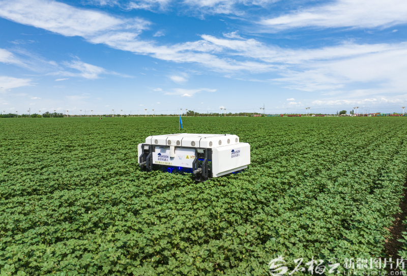 7月23日,在昌吉市榆树沟镇榆树沟村的棉田里,棉花激光打顶机器人正在作业。何龙摄