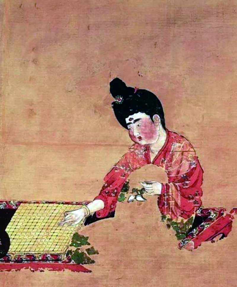 1972年,考古工作者在吐鲁番阿斯塔那187号墓中发现了一幅绢画《弈棋仕女图》,画中贵妇体态丰盈、面庞红润,身着红缎团花斜领长裙宽袖,腰束黄底绿花彩带,头梳天宝髻,扎一朵红色小花,端坐棋盘一边,右手食指和中指拈起棋子,神态投入,似为寻得落子之处费心思量。