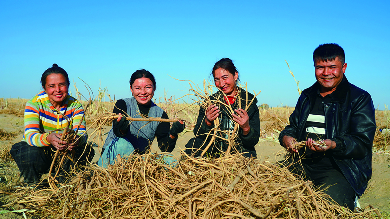 民丰县尼雅镇甫甫克村村民分选鲜肉苁蓉。图拉罕・奥斯曼/摄 以塔克拉玛干沙漠防沙治沙为例,固沙种植的梭梭、红柳之下可培育“沙漠人参”肉苁蓉,既能发挥其医药、药食同源的价值,守护人民健康,又能带动百姓增收、助力乡村振兴,还能实现生态治理,形成国家防沙治沙的绿色屏障。 作为肉苁蓉核心产区,于田县肉苁蓉种植面积24万亩,产量占全国85%,当地以“产业生态化、生态产业化”为引领,推动肉苁蓉产业发展,实现沙漠增绿、产业发展、集体增收、农民受益的多赢局面。策勒县策勒乡托帕艾日克村村民图尔洪·买提塞地,正是这一发展之路上的受益者。 今年54岁的图尔洪,在沙漠戈壁种植红柳和梭梭,并在其根部接种肉苁蓉,使用滴灌种植技术,这些植物的成活率达90%,它们既可防风固沙,也为他带来了可观的收入。“2023年,我在自家地里接种了肉苁蓉,一年收入超过30万元。”图尔洪说,这样的生活,以前想都不敢想。 在皮山县,独特的光、热、水、土条件,让产出的瓜蒌品质及药用价值远高于国内其他省市,也让阿力木·麦麦提敏在内的2500余名群众的钱包越来越鼓。 阿力木是皮山县藏桂乡库勒艾日克村村民,在新疆徽岳记生物科技有限公司瓜蒌种植基地工作。“基地建起来以后,我再也不用外出打工了,既能照顾老人孩子,还能学技术挣钱。”阿力木告诉笔者,他在瓜蒌种植基地工作两年了,现在负责瓜蒌根烘干,每个月收入4500元。 瓜蒌是一种多年生葫芦科作物,其果实、果皮、果仁、根茎均为上好的中药材。作为安徽援疆重点产业,瓜蒌产业于2023年9月落户皮山县藏桂乡。目前,新疆徽岳记生物科技有限公司种植瓜蒌4.7万亩,带动2500余人长期稳定就业,人均月工资3000元。未来,该公司计划将基地规模扩大至10万亩,届时可带动1.1万人就业,年产值不低于20亿元。 瓜蒌产业不仅带来了可观的经济效益,生态效益也日益凸显。新疆徽岳记生物科技有限公司片区负责人杨锦涛说:“瓜蒌根系发达,适合在沙质土壤生长,可以起到防风固沙的作用,对改良土壤也十分有益。”