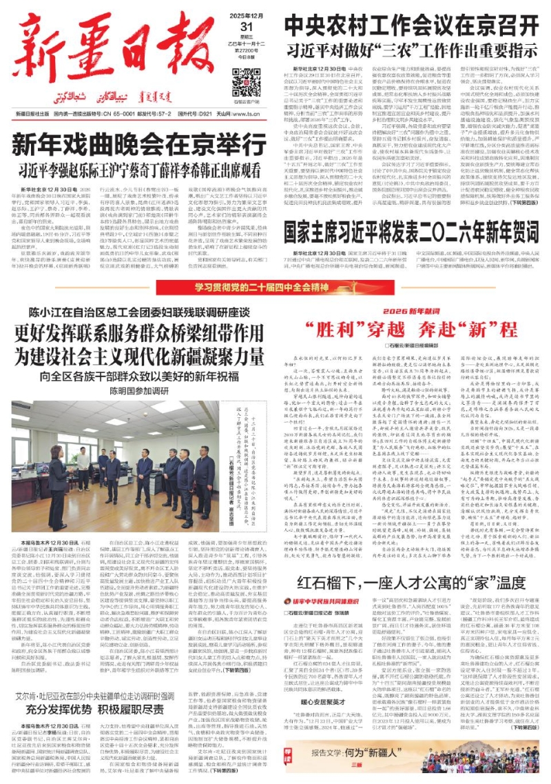 石榴云/新疆日报编辑部 在永恒的时光里,以何标记岁末年初? 这一次,答案震人心魄:直面亘古的天山山脉,一个不可思议的奇迹,以长虹之势贯通南北,打开时空全新畅想,勾勒出这片热土灿烂的未来。 穿越天山胜利隧道,延伸向前的道路,宛如一个宏大的隐喻:过去一年在日夜兼程中飞驰而过,新一年的笃行不辍已迎面而来,我们正昂首阔步走向下一个胜利! 回首过去一年,金秋九月深深烙进2600万新疆各族儿女的共同记忆,我们迎来新疆维吾尔自治区成立70周年的欢庆时刻。沐浴党的光辉,各族人民团结奋进铸就岁月辉煌,立足历史坐标凝望,来时路上的风雨兼程,昭示新疆“新”程注定可期可待。 凝望岁月,这是厚积薄发的新起点。 “在新起点上,希望自治区和兵团的同志,再接再厉、接续奋斗,努力把各项工作做得更好,开创新疆更加美好的明天。” 在具有里程碑意义的历史性时刻,满怀对新疆各族人民的深厚情谊,习近平总书记率中央代表团出席庆祝活动,亲自为新疆工作定向领航。亲切关怀温暖人心,殷殷嘱托激发奋进力量。 七十载砥砺前行,烙印下一代代人的铿锵足迹,见证着中国共产党边疆治理的丰功伟绩。胼手胝足塑造的山河新颜,处处可见勇气、毅力与智慧的凝结。我们自豪于累累硕果,是向过往岁月不懈耕耘的致敬,更是信心满怀地向未来宣告,以自治区成立70周年为新起点,新疆必将坚定不移沿着总书记指引的正确方向再接再厉、接续奋斗。 聆听大地,满是触动心弦的新故事。 面对40米的狭窄深井,和田女辅警以瘦小身躯,诠释了舍生忘死的大义;注视着冉冉升起的五星红旗,新疆小学生在天安门广场流下的一滴泪,在全网激荡起了爱国情怀的涟漪;撞伤一只羊,却被羊的主人邀请共享美食,牧民的慷慨,印证着辽阔土地孕育出的胸怀;在四川工作的自媒体博主赴新疆修复“为人民服务”飞行地标,血脉中的红色基因在线上线下觉醒…… 交往交流交融中的真情流露,无需刻意探寻,足以抵达心灵深处;讲不完的动人故事,发生在现在,也必将回响于未来。当故事的讲述超越边疆叙事,转换为天南海北游客的全视角感悟,一次次跨越山海的情感共鸣,将中华民族共同体意识深深根植于心。 感受变化,洋溢开放发展的新活力。 “风光”无限,不仅是涌动在国家能源动脉中的清洁能源,还向绿色算力这一新兴领域开疆拓土——勇于在攀登时眺望更高峰,延链、补链、强链,集链成群的产业发展态势,打开高质量发展的全新天地; 自治区两会主动敞开大门,迎接国内外关注的目光;多次在天山脚下举办国际论坛会议,展现睦邻友邻的担当——身处亚洲地理中心,立足丝绸之路经济带核心区,坦荡襟怀照见勇毅前行的从容自信; 或许是博物馆里的一方印鉴,或许是舞蹈节上的裙裾飞扬,或许是赛场上的激情呐喊,或许是读书节里的文墨清香——是滴滴春雨催开了百花,是绵绵之力涵养着各族人民的文化认同与自信。 展望未来,奔赴光明灿烂的新征程。 当时间指针指向2026,又是一段非凡历程的精彩开端。 回顾“十四五”,中国式现代化新疆实践迈出坚实步伐;展望“十五五”,在基本实现社会主义现代化夯实基础、全面发力的关键时期,开局之年当以必胜之势谋篇布局。 纵横历史维度与战略考量,新疆的“起手式”要锚定党中央赋予的“五大战略定位”,牢牢把握国家重大战略引领、重大政策支撑的机遇期,乘势而上、大有可为的上升期,推动高质量发展、夯实社会稳定和长治久安根基的关键期,清醒认识风险挑战、充分发挥自身优势,确保“十五五”开好局、起好步。 苟日新,日日新,又日新。 若说时光有眷顾,一定会赞许累积寸进之功、勇于探索创新的人们。新征程上的每一天,召唤着我们以踔厉奋发的新姿态,为川流不息的大地增添奔腾气势,为下一个胜利跑出一个好成绩。 相关新闻 石榴云客户端2026新年献词 | 烟火新疆,快慢行远 天山网2026新年献词丨每一缕烟火,都是世界看见的光