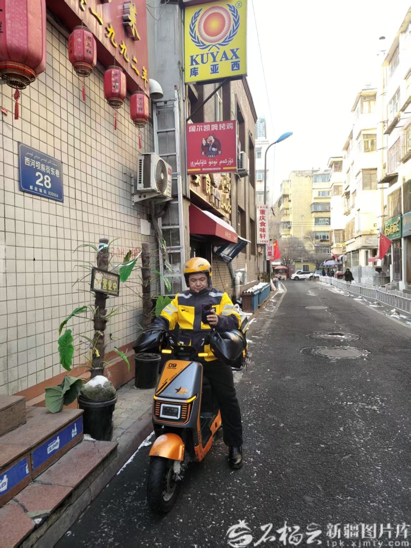 1月1日,外卖骑手迪力木拉提·吐依洪在送餐途中。石榴云/新疆日报记者 张冬梅摄