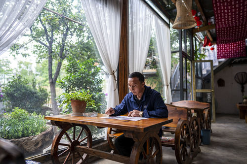 大理市湾桥镇古生村村民何利成在自家的客栈里休息(2020年5月30日摄)。新华社记者 江文耀 摄