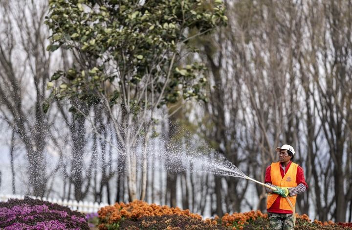 工人为大理市环洱海流域湖滨缓冲带生态廊道的鲜花浇水(1月11日摄)。新华社记者 江文耀 摄