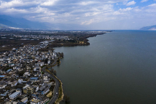 大理市环洱海流域湖滨缓冲带生态廊道逐步完善(1月11日摄,无人机照片)。新华社记者 江文耀 摄