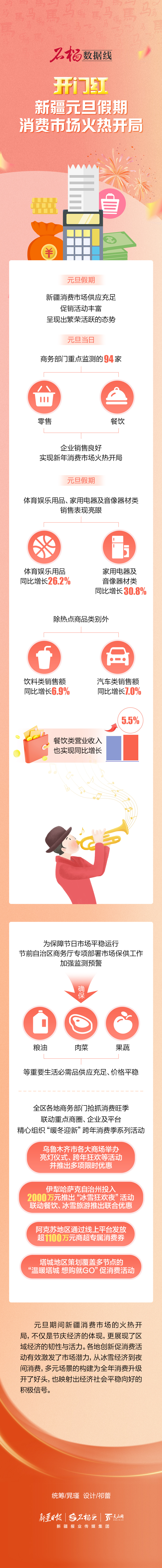 元旦假期,新疆消费市场供应充足,促销活动丰富,呈现出繁荣活跃的态势。元旦当日,商务部门重点监测的94家零售、餐饮企业销售良好。