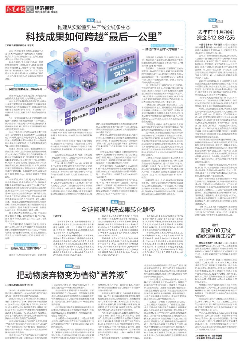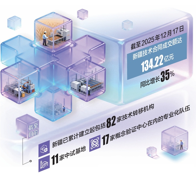 制度金融双轮驱动 实验室成果走向田野与车间 成果转化,源头活水是关键。如何让实验室里的成果走出高阁,走向田野与生产线? 在自治区农业科学院作物研究所,南疆冬小麦遗传育种创新团队首席研究员黄天荣正带领团队进行种质资源分析。他们历时多年选育的冬小麦品种“新冬60号”,不仅具有丰产、早熟的优良性状,更被发现有突出的耐盐抗逆基因。 “这一发现为新疆冬小麦应对盐碱胁迫和极端气候提供了新的遗传资源与育种方向。”黄天荣介绍,团队正进一步利用生物育种技术挖掘相关基因,致力培育出更适应新疆地域特点的优质突破性品种。 目前,“新冬60号”已在南疆累计推广350万亩,成为当地冬小麦主栽品种。从实验室走向广阔田野,这一品种的成功转化,其背后离不开一套系统性的源头支撑体系——制度激励与金融活水双轮驱动,正为更多科技成果的“破土而出”提供关键助力。 制度上,2022年,新修订的《新疆维吾尔自治区实施〈中华人民共和国促进科技成果转化法〉办法》确立了以转化为导向的考核机制,将转化成效与职称评定、岗位聘用直接挂钩,并保障重要贡献人员获得不低于70%的奖励报酬,破解“不愿转”的难题。金融上,知识产权质押融资深度融入转化全链条。2025年,自治区市场监督管理局通过系列专利转化对接活动形成的“需求对接+金融赋能”模式,直接促成质押融资3220万元,精准滴灌轻资产科技企业。 双轮驱动,成效立显。越来越多的科研成果走出实验室、转化为现实生产力。自治区农科院全年实现转化收入6400万元,其中“农产品减压熏蒸保质减损技术”以1200万元成功转让,棉花品种转让500万元,春小麦系列品种转让465万元;加工番茄育种技术、甜菜种子丸粒化技术分别以49%股权占比,联合企业成立注册资本1000万元的合作公司等。更令人瞩目的是,一场覆盖全疆的专利转化在2025年取得突破:自治区市场监督管理局围绕重点产业举办对接活动,促成专利签约156件,金额达1.0081亿元,签约金额同比激增14倍。 随着成果持续奔向市场,全区技术合同成交额显著增长。截至2025年12月17日,全区技术合同成交额达134.22亿元,同比增长35%。 “这表明市场活力得到充分激发,印证了我们从源头进行系统性破题的努力方向是正确的,新疆的科技成果转化正在迈入一个规模与效能同步提升的新阶段。”自治区科技厅成果转化与科技奖励处处长吐尔逊江·哈力克说。