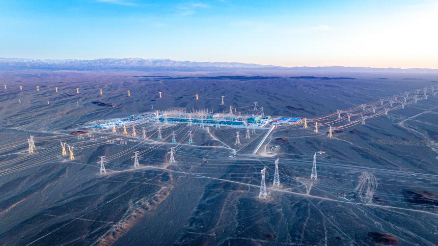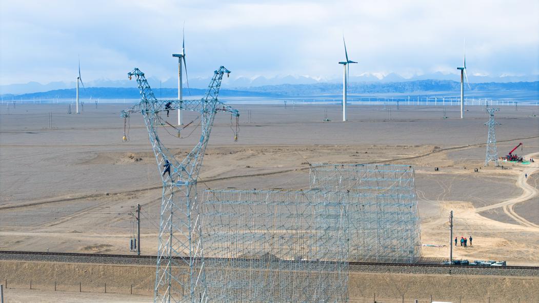 新能源输电线路跨越高速公路施工现场。冯洋 摄 为实现资源优势向发展优势高效转化,哈密公司全力助推能源产业驱动升级。积极推进当地电源点的建设布局,将电网发展规划与新能源发展、超特高压外送落点以及疆电外送通道有机融合,形成协同共进的发展格局。 “十四五”期间,哈密电网规模较“十三五”翻了一番。相继建成投产±800千伏巴里坤换流站、750千伏伊吾变等重大工程,已形成以2座±800千伏换流站为中心、5座750千伏变电站为支撑、110座220千伏变电站交织全域的“两中心、五支撑、五环网”主网架供电格局,并有效向新能源开发基地延伸,满足大规模风光基地的接入和送出需求。 “密制服务” 疏通能源并网高速路 哈密新能源产业飞速发展的壮举背后,是一整套不断完善服务体系的有效支撑。面对新能源并网任务繁重、电网安全压力增大的双重挑战,哈密公司深化“密制服务”品牌建设,构建“五融五促”工作机制,让党组织的政治优势和组织优势在服务新能源发展中焕发出蓬勃生机。 “密制服务”共产党员服务队成为戈壁滩上的一道亮丽风景。在哈密—重庆特高压等重点工程建设现场,临时党支部的旗帜迎风招展,党员责任区标识清晰可见。2025年6月,哈密─重庆±800千伏特高压直流输电工程投运,此后每年将有超180亿千瓦时绿电通过哈密─重庆特高压工程直送川渝大地,相当于每年节约标煤600万吨,减少二氧化碳排放约1600万吨。