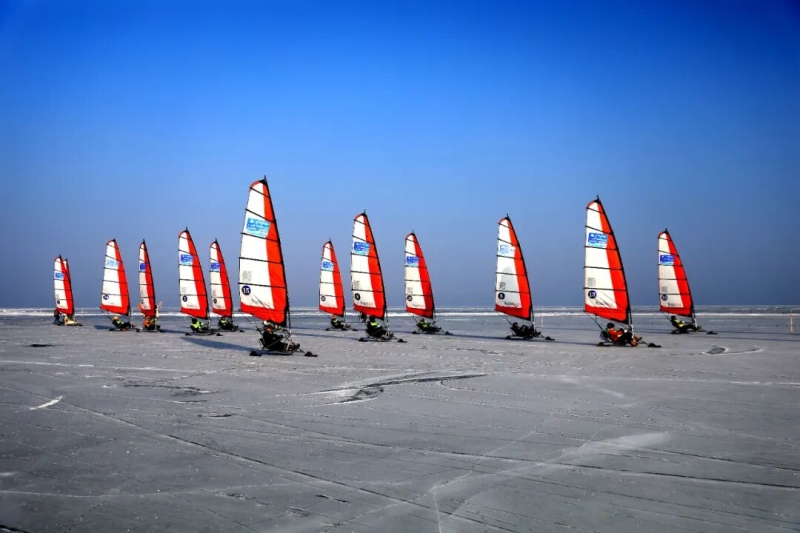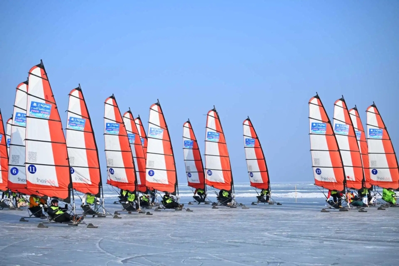 选手比赛中。 在千里冰封的博斯腾湖湖面上,一面面彩色风帆排成一列。随着裁判一声令下,伴随着阵阵强风,一艘艘冰帆如离弦之箭冲出起跑线,在光滑如镜的冰面上划出一道道闪亮的轨迹。选手们围绕浮标迂回转弯,在直线赛段全力冲刺,展现出冰帆运动的竞技魅力。 河北参赛选手汤小飞说:“这次在博斯腾湖比赛体验非常棒,湖面的冰质和风力条件都特别适合冰帆运动。大家通过比赛相互切磋、共同拼搏,也在交流中提升了技术,希望未来能把这项运动推广到更多地方。” 新疆参赛选手王钦也分享道:“冰帆结合了帆船的速度感和冰面的流畅感,在博斯腾湖这样开阔的冰面上驰骋,既刺激又享受,是一次难忘的冰雪体验。”
