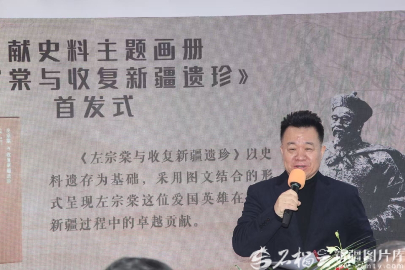 首发式现场,新疆文化出版社党委书记、董事长、总编辑沈岩致辞。张启明摄 新疆文化出版社党委书记、董事长、总编辑沈岩表示,左宗棠“舁榇(yú chèn)出征”所体现的“寸土不让”的担当与忠诚,是跨越时代的精神财富。出版该画册,是新疆出版界自觉践行文化使命、回应时代课题的重要举措,“该书的出版,不仅丰富了新疆历史与左宗棠相关研究的文献宝库,也为社会各界提供了一部感悟爱国主义、增强历史自觉的生动读本。它的发行,将进一步激发各族群众铭记历史、守护国土、团结奋进的共同心声,为在新征程上建设美好新疆凝聚精神力量。”