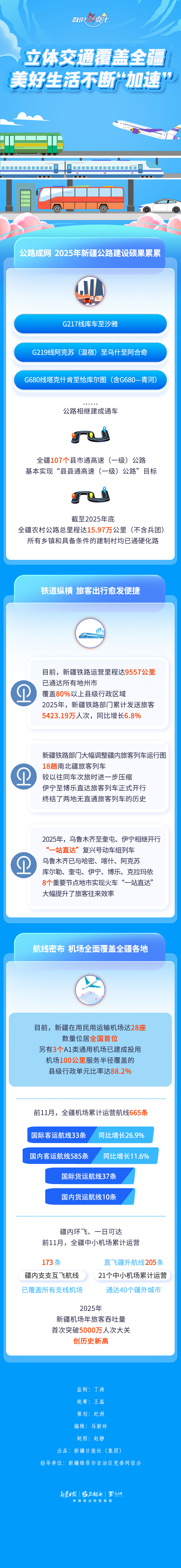 交通是推动区域战略发展的强劲引擎,是实现民生幸福的重要载体。2025年,新疆锚定高质量发展目标,紧抓交通强国建设机遇,大力发展综合立体交通。截至目前,新疆拥有运输机场28座,铁路运营里程9557公里,公路总里程超23万公里(含兵团)……还有哪些亮眼成绩?本期《数说“新”变化》一起来了解。