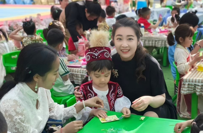□余欣蓓 我是湖北省武汉市常青童梦幼儿园的一名老师,今年38岁。2024年9月,我和同事一起报名参加援疆工作。目前,担任博乐市第一幼儿园园长。适应了新环境后,我给自己定下了目标:凭借20多年的幼教经验,让诗歌浸润课堂,用文化滋养童心。 我牵头组织老师开展手工创作活动,收集纸箱、泡沫等闲置的废弃材料,和孩子们一起做手工艺品。一有时间,我便引导老师们开展实景教学,带领孩子们亲近大自然,一起捡拾松果、干树枝和落叶;孩子们也把家里的塑料瓶、奶粉罐、牙膏盒带到幼儿园。我们一起做出了刺猬、小木屋、卡通床等造型可爱的玩具,并在走廊和教室墙面画画、贴小红花,原本单调的墙面,就此变得充满童趣和文化气息。 为了调动孩子们的学习兴趣,我将唐诗宋词以讲故事和唱歌的形式融入日常教学,开设了“诗韵童心”课堂。通过晨读时播放古诗音频,搭配草原、山川、河流等实景图片,让孩子们在听觉与视觉的双重体验中感受诗歌的韵律与意境。