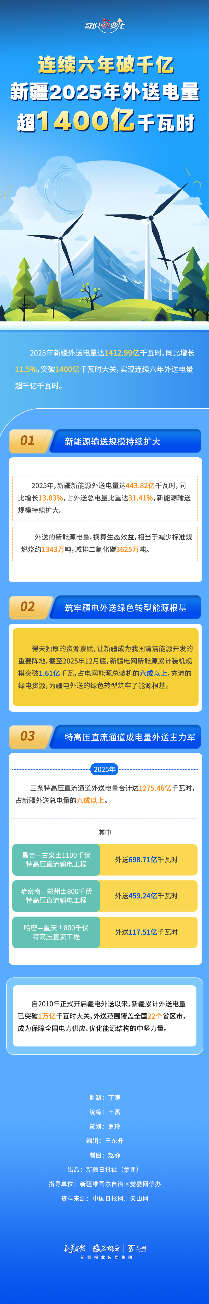 2025年新疆外送电量达1412.99亿千瓦时,同比增长11.5%,突破1400亿千瓦时大关,实现连续六年外送电量超千亿千瓦时。亮眼数字的背后,是新疆在保障能源供应、优化输送通道等方面付出的持续努力。本期《数说“新”变化》带您一探究竟。
