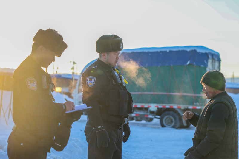 1月16日,阿勒泰边境管理支队吐尔洪边境派出所民警向辖区群众宣传各项冬季安全常识。通讯员 金磊鑫摄 石榴云/新疆法治报讯(记者 韩晋 通讯员 金磊鑫报道)1月17日的富蕴县吐尔洪乡被极寒寒潮包裹,最低气温降至-47℃。刺骨寒风中,新疆出入境边防检查总站阿勒泰边境管理支队吐尔洪边境派出所的民警们成为群众的“邻家守护者”。“我们推出‘邻家警务’工作模式,就是要让民警和群众成为亲人。”所长蔡俊说。