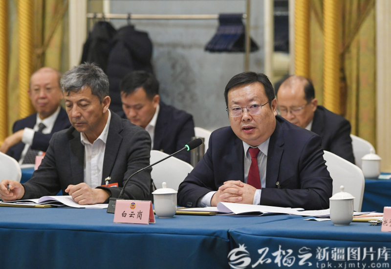 1月29日,农业界、环境资源界委员分组讨论政府工作报告、自治区“十五五”规划纲要草案、两院工作报告等。白云岗委员(前排右一)围绕发挥水利支撑作用,加快优质农牧产品重要供给基地建设等内容发言。石榴云/新疆日报记者 约提克尔·尼加提摄