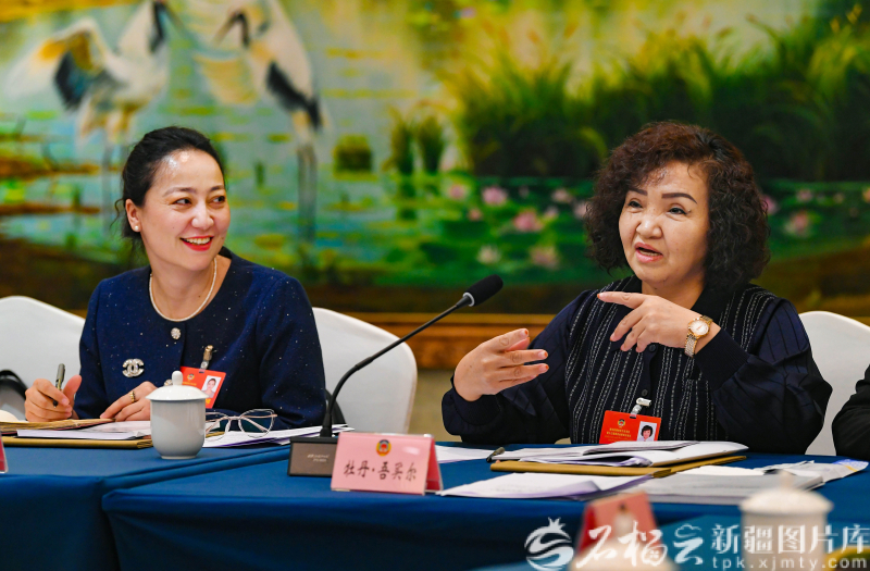 1月29日,农业界、环境资源界委员分组讨论政府工作报告、自治区“十五五”规划纲要草案、两院工作报告等。牡丹·吾买尔委员(右)围绕加大水资源高效利用等内容发言。石榴云/新疆日报记者 约提克尔·尼加提摄