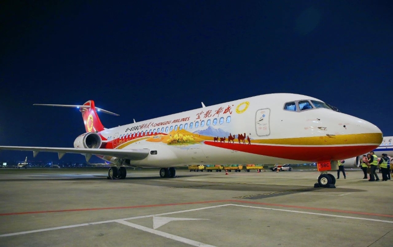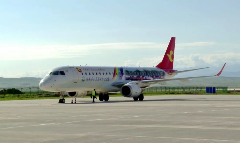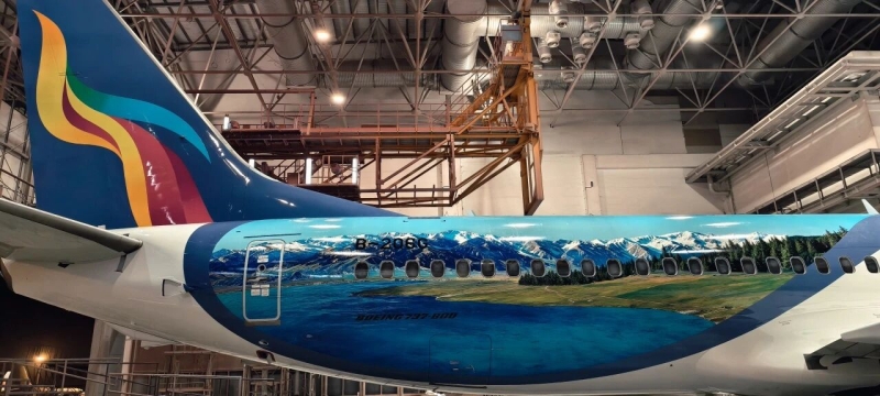 “大美新疆号”客机。 如成都航空的“大美新疆号”客机,机身以红黄飘带贯穿延展,勾勒出沙漠、天山和胡杨林的壮美轮廓,哈密、克拉玛依等地标建筑与自然景观有机融合,呈现出一幅大气磅礴的新疆全景画卷;天津航空的“昭苏天马号”客机,外观以天山山脉为背景,绘制了昭苏县标志性景观天马浴河和彩虹,为推介昭苏旅游资源增光添彩。