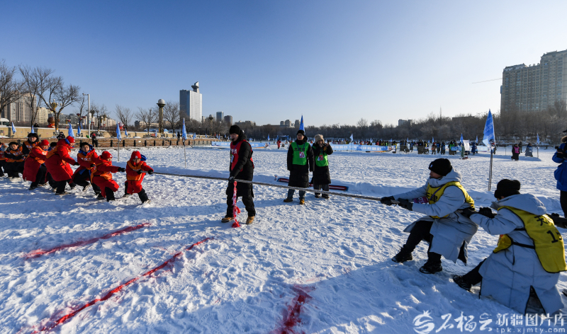 1月30日,南湖市民广场“玩冰乐雪”体验活动现场,来自各省区的队员参加拔河比赛。