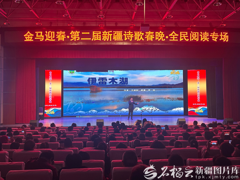 1月30日,金马迎春·第二届新疆诗歌春晚——全民阅读专场现场。常江萍摄 现场,朗诵者陈飞燕朗诵刘亮程《春天的步调》,语调舒缓绵长,将早春大地的苏醒、草芽的萌发、虫鸣的轻响娓娓道来;朗诵者李旭演绎汪剑钊《伊雷木湖》,低沉的嗓音搭配舞台上的湖水意象,将戈壁湖畔的苍茫与静谧展现得淋漓尽致,让人心生向往…… 整场晚会以“春天里”“新疆好”“天山下”“祖国颂”四个篇章层层递进,朗诵、音乐、舞蹈有机融合,让现场观众仿佛置身于诗的画卷之中。 李秋玲、李知恒联袂朗诵的李娟作品《河边空旷的土地》,二人默契演绎用细腻的文字勾勒出新疆春日河畔的清新图景。12岁的李知恒是当天年龄最小的朗诵者,他说:“李娟老师的文字特别动人,字里行间都是对新疆的热爱。” 新疆作家协会理事、第二届新疆诗歌春晚导演王国民介绍,本届诗歌春晚在内容甄选上,立足本土、致敬经典,以新疆诗人的原创作品为主轴,精选了刘亮程、熊红久、李娟等深入反映边疆自然与人文风貌的诗篇,同时融合梁启超、汪国真等经典作品。 “我们希望呈现一场既具诗性美学、又有泥土气息的视听盛宴,让诗歌成为连接大众情感与地域文化的纽带。最终期待激发观众对阅读与乡土的热爱,在艺术共鸣中深化文化自信、增进民族团结。”王国民说。 米东区坚持以创新形式推动阅读融入百姓生活。通过持续开展“阅读+”系列活动,将诗歌朗诵、艺术展演与读书分享深度融合,阅读从书本走向舞台、从个体走向群体,让广大群众在艺术熏陶中感受阅读魅力。“后续我们将持续推动阅读融入生活、浸润心灵,让书香成为城市最温暖的气息,带动全民阅读新风尚。”米东区委宣传部副部长梁毅说。