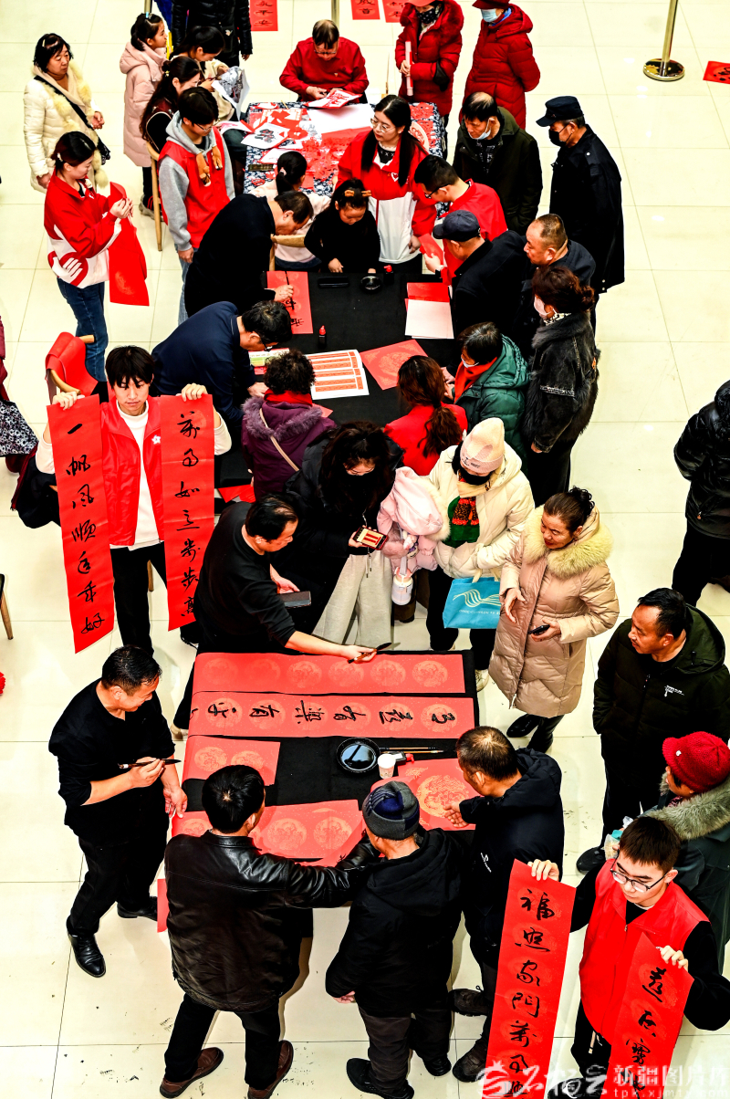 1月31日,呼图壁县文联与县图书馆联合举办“文润庭州·翰墨风采”迎新春文化活动,书法家挥毫书写,为各族群众送上春联与“福”字,营造出欢乐祥和的新春氛围。 陶维明摄 铁龙驰疆