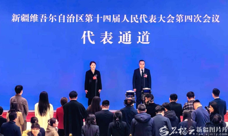 1月27日上午,自治区十四届人大四次会议“代表通道”集体采访活动现场,阿拉法特·艾海提(右)、马新艳(左)两位代表接受采访。石榴云/新疆日报记者 蔡增乐摄 监制:宋君 主编:于雷 编辑:王禹 制作:王禹 出品:石榴云/新疆日报图片新闻部