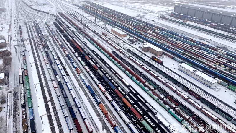 2月5日,在阿拉山口站编组场内,出入境中欧(中亚)班列在编组。格日乐图摄 阿拉山口是我国向西开放的重要国门铁路口岸,国际货运核心枢纽。班列出境时满载“中国造”,通达德国、波兰等21个国家和城市,入境时则满载国外货物。 车站4个作业场、72条线路365天不间断作业。密集时,每20分钟就有一趟中欧(中亚)班列从这里进出,相当繁忙。 这些钢铁巨龙没有后视镜,如何“见缝插针”般倒入指定股道和货场? 这个问题刚抛出来,一场教科书式的回答就开始了。 在距离记者最近的区域,一趟长约700米、高约五六米的中欧班列进站,火车带动的一股强大的气流扑面而来。 刘大盼、宋震和谢恒帅三位“黄金搭档”出场了。 他们是中国铁路乌鲁木齐局集团有限公司阿拉山口站运转车间职工。这哥仨像“钢铁蜘蛛侠”,面对让记者看得眼花缭乱的班列,他们如游龙般丝滑操作。 “这个场面有点像快递分拣中心,车厢如同一件件快递汇集到此。我们在编组场打散、分拣、调动车厢。然后把去同方向的一节节车厢归拢、连结,组成新的班列,交由火车头牵引出站。”宋震向记者说着自己的工作流程。 “准备作业,注意瞭望!”调车长刘大盼发出作业指令。 刘大盼率先爬上车梯,站在驾驶员旁的通台上,一手紧攥扶手。连结员宋震和谢恒帅用力跺脚,抖落鞋底积雪防止打滑,随即抓着车厢外侧车梯攀爬而上。宋震“挂”在车列中部,谢恒帅扒在车列尾部。