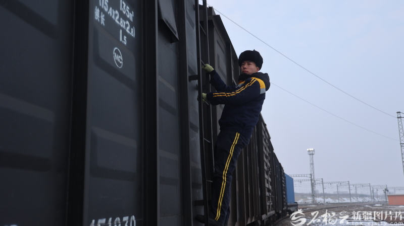 2月5日,刘大盼和宋震(右)一起检查火车的制动状态。赵越摄 “2025年,阿拉山口铁路口岸通行中欧(中亚)班列8165列,同比增长6.3%,过货量达到1786万吨。”阿拉山口站运转车间党总支书记魏大海介绍。班列开行数量逐年攀升,连结员们每天都在和时间赛跑。 稍事休息,哥仨下午的工作开始了。攀爬、瞭望、摘挂、编组,他们重复着上午的作业。 “我们的动作快还是慢,直接关系着班列进出境的速度。”刘大盼说。 一天下来,他们完成了800辆车厢的拆解、编组作业,每人行走步数超过3万步。