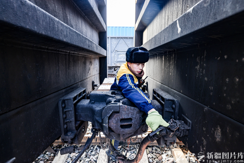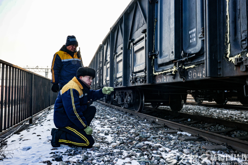 2月5日,宋震“挂”在车列上进行跟车作业。龙证宇摄 此刻,宋震、谢恒帅是司机的“眼睛”,也是班列的“领航员”。常年在一线作业,他们练就了火眼金睛:车辆与站台、股道边缘的距离有多长,信号灯、轨道状况咋样……这些信息大声反馈给调车长刘大盼,他立刻向司机发出“慢行”“制动”“前进”等指令。 长长的班列就这样在他们的指引下行驶三四公里,在股道间平稳切换,准确抵达指定货场。 阿拉山口寒风刺骨,此时记者手中的笔冻得写不出字了,寒风钻进骨头缝里,嘴唇也冻得发僵。而刘大盼、宋震和谢恒帅丝毫未受影响。 下一步,就是拆解作业。首先得把车厢固定好。宋震在铁轨和车轮之间放上防溜“铁鞋”。这个小物件不能小看:班列又长又高,阿拉山口常年大风肆虐,没有防溜“铁鞋”固定,庞大的班列会被大风吹动滑溜,严重时会脱轨和翻倒。 接着,宋震蜷着身子,钻进两节车厢之间的缝隙里,开始摘解连接车厢的软管。谢恒帅则在股道旁核对车号。