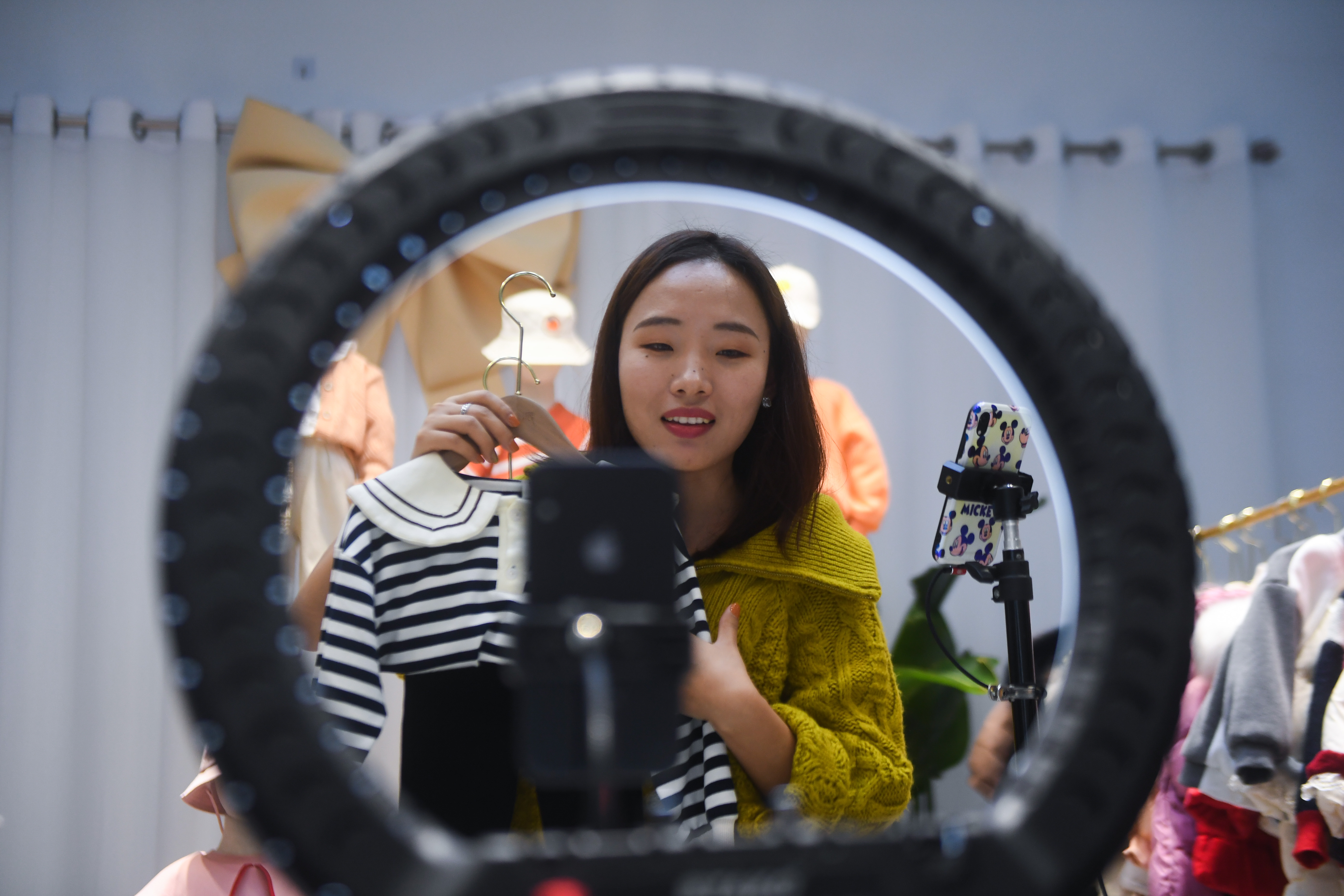 2021年2月8日,浙江省湖州市吴兴区织里镇一家童装电商的工作人员在直播销售童装。