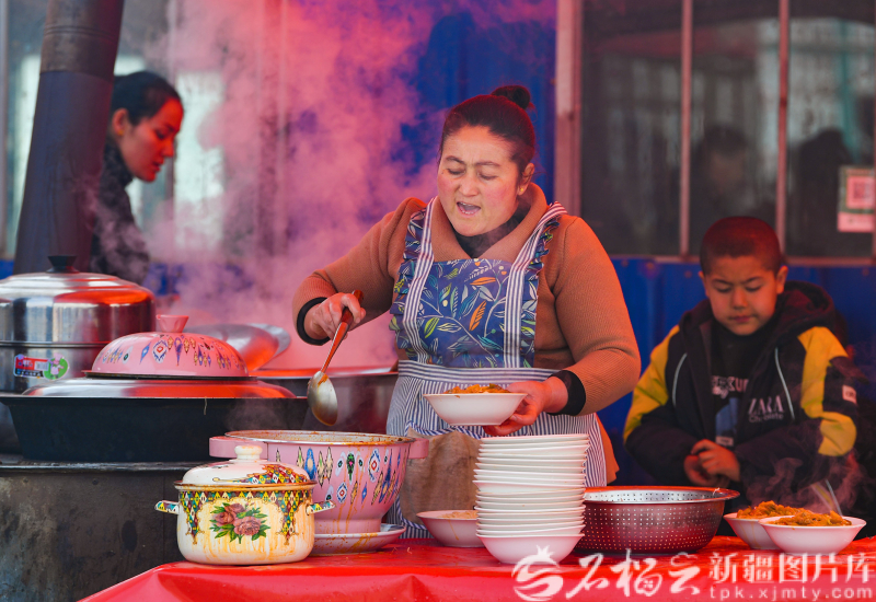 2月11日,皮山县木吉镇巴扎上的拉面摊厨师正在制作美食。