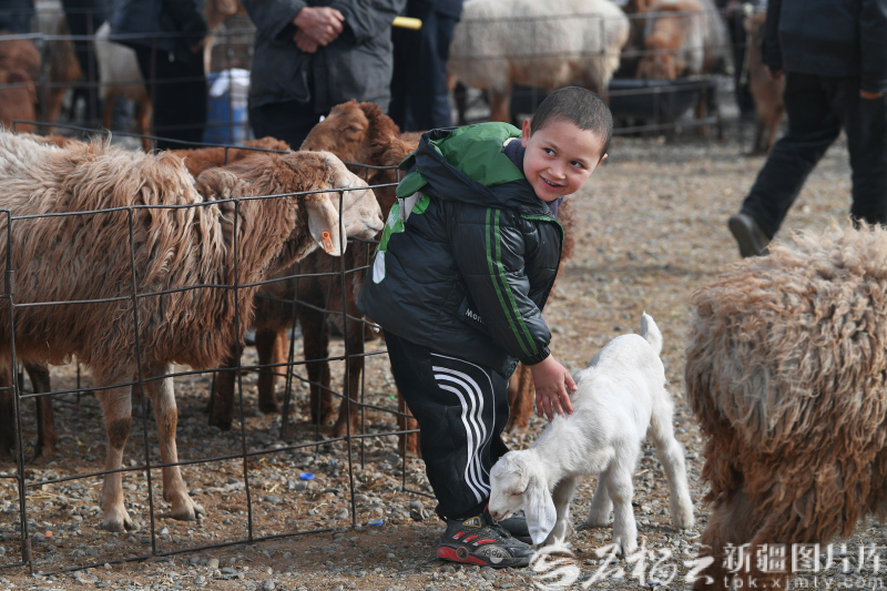 2月11日,小朋友在皮山县木吉镇巴扎活畜区和小羊玩耍。
