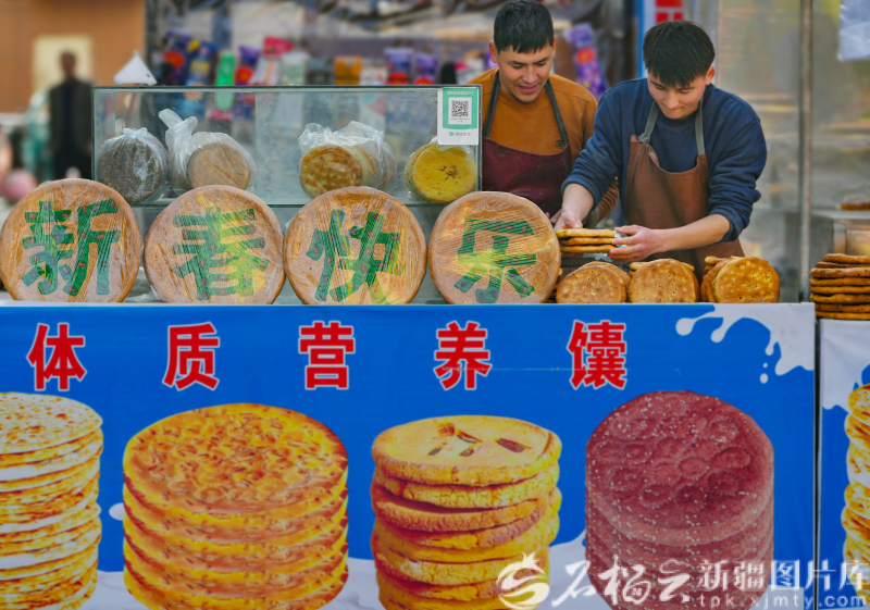 12月12日,在洛浦玉街年货大集,烤馕师傅制作出带有新春快乐字样的大馕销售。 洛浦玉街地处县城核心区,曾是群众生产生活物资重要集散地。该县创新采用“社会资本筹集+群众自拆自建”模式,对街区改造升级,建成6栋楼宇、94间门面房,打造出业态多元的商业新地标和15分钟便民生活圈,为年货大集筑牢平台。