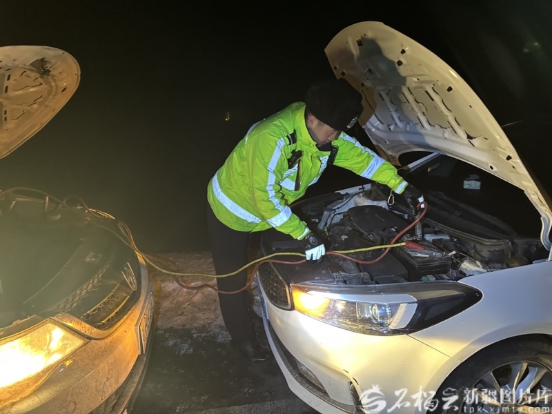 2月11日,富蕴县公安局喀拉通克镇派出所民警为亏电车辆搭电救援。阿勒特乃·努尔木拉提摄
