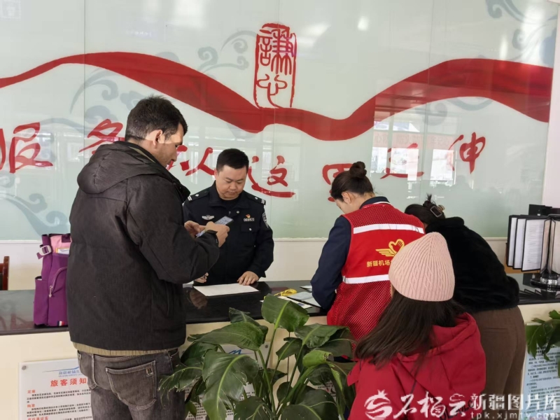 新源县公安局机场派出所民警向旅客开展未成年人安全宣传。谢秦怡摄