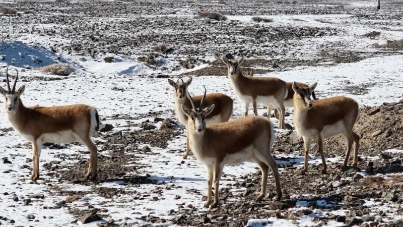 2月15日,记者在伊吾县盐池镇与前山乡之间的公路两侧,看见一群野生鹅喉羚,或在路边草丛中悠闲觅食,或结伴在积雪覆盖的路基旁轻盈奔跑,灵动的身影与苍茫的戈壁山野、蜿蜒的公路相映成趣。