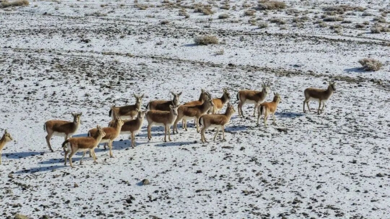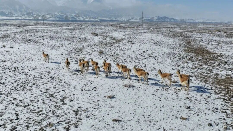 在伊吾县的冬日山野间,国家二级保护动物鹅喉羚正踏雪而行。