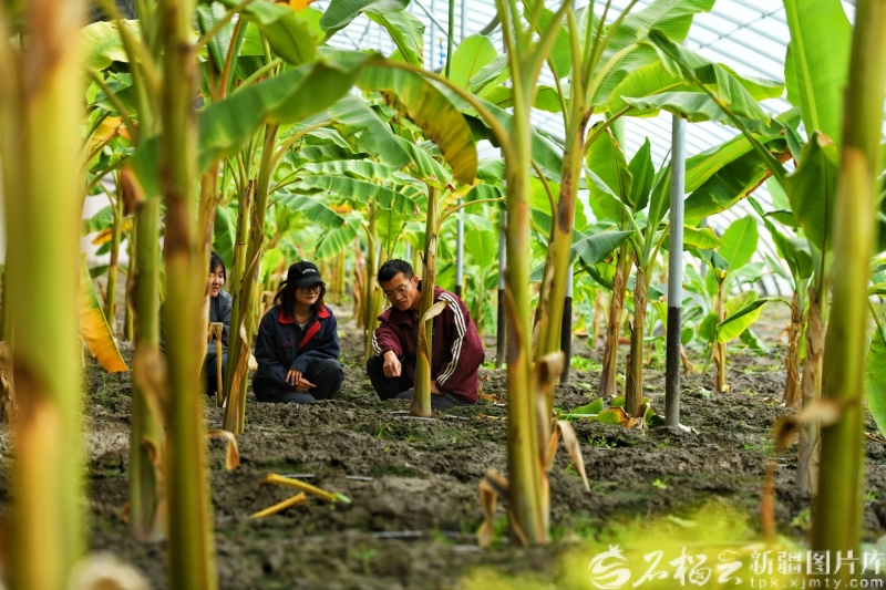 2月18日下午,在库尔勒市英下乡英冠田园小镇, 朱星凯正在给游客讲解香蕉种植知识。