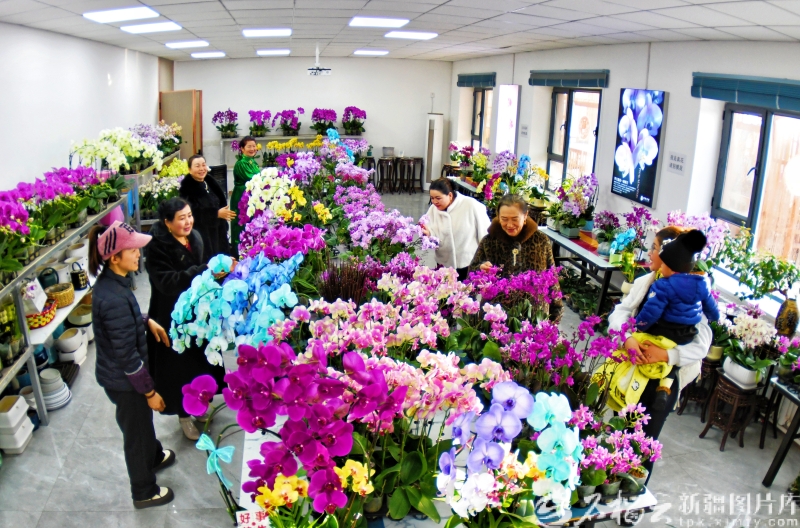 2月18日下午,哈拉玉宫镇四季牧源农业科技示范产业园中,游客在挑选蝴蝶兰。