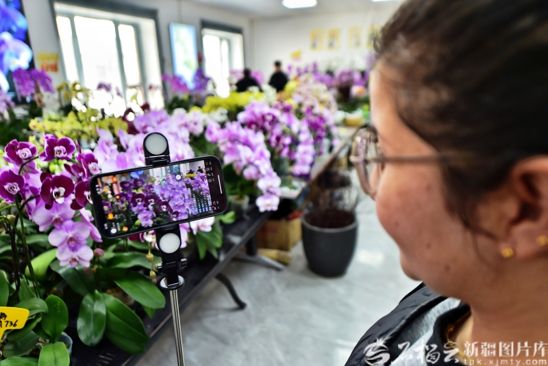 2月18日,哈拉玉宫镇四季牧源农业科技示范产业园的工作人员,现场直播促销蝴蝶兰花。