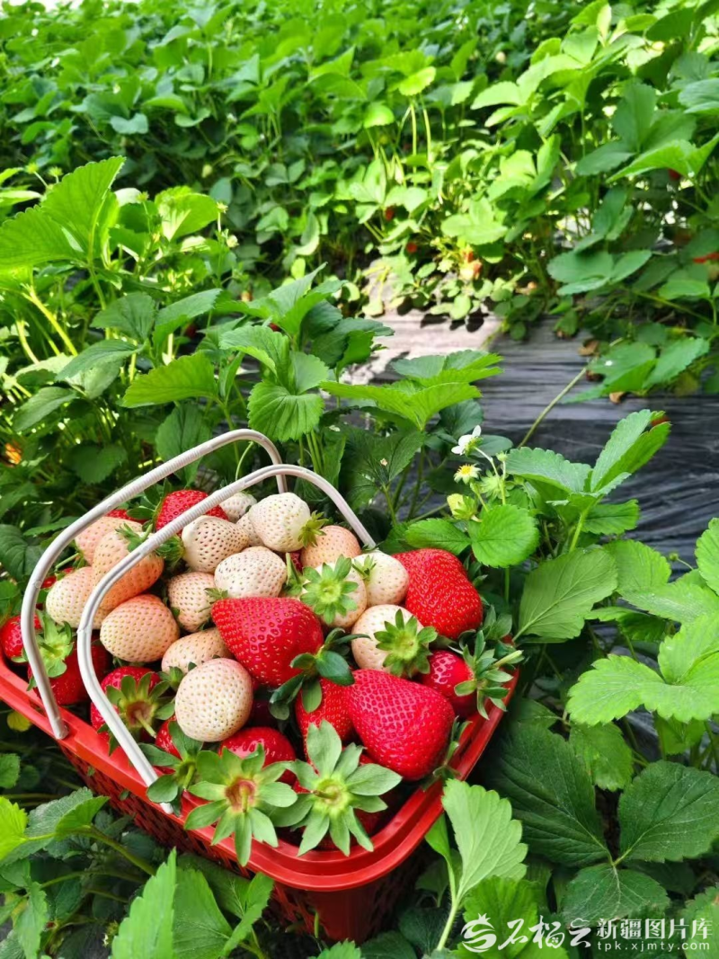 游客正在摘草莓。石榴云/新疆日报记者 王新红摄