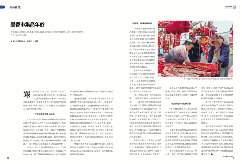 在新疆大地的烟火市集里,春联、窗花、灯笼这些传统年俗符号,成为书写“我们的节日”的生动注脚。 ●《今日新疆》记者 刘俊佑/文图 寒意未消,年意已浓。记者近日走访了乌鲁木齐市、昌吉市的部分商超集市,目之所及皆是热烈的中国红——烫金春联垂成锦帘,镂空窗花叠作云霞,串串灯笼摇落暖光,墨香、纸香、烟火气交织奔涌,汇成一曲浸润人心的中华文化交响。 节庆氛围点燃文化共鸣 1月27日一大早,乌鲁木齐新联农副产品综合市场年货专区已是人声与红色交织的海洋。灯光穿透晨雾,照亮一排排悬满廊柱的春联、福字与灯笼,红得热烈、亮得温暖,将冬日的清冷尽数驱散。身着传统绣花裙的佟晓英驻足摊位前,指尖轻点墨色春联:“春满人间百花吐艳,福临小院四季常安”,这副贴大门正合适。摊主老陈麻利卷好对联,笑着递上一对小灯笼:“过年图个红火,送您添喜气!”