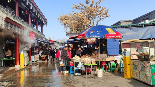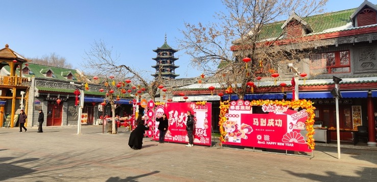 孩童在昌吉小吃街上玩耍。天山网-新疆日报记者 马新玲摄 “我是从奇台来走亲戚的,今天天气好,来转转。这里吃的也多,转一圈都快吃饱了。”刘女士一边拍照一边笑着说。 位于昌吉市建设北路与宁边西路附近的昌吉小吃街是国家3A级旅游景区,游客络绎不绝。这里不仅是美食的汇聚地,更成为市民游客品味传统文化、欣赏特色建筑、乐享团圆的“年味打卡点”。其中,自治区级非物质文化遗产——九碗三行子,以其独特的仪式感与深厚底蕴,吸引了不少人前来品尝,这项传统的技艺在升腾的烟火气中焕发新生。 在阳光的照耀下,昌吉小吃街大门边上“马年大吉,马到成功”的新年祝福格外显眼,喜庆的音乐和欢声笑语传递出浓浓的年味。